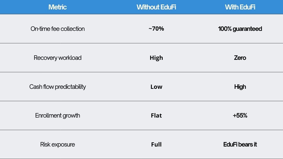 EduFi pays your university upfront, in full. Students repay EduFi in flexible monthly installments. You collect immediately. We handle the credit risk and recovery.