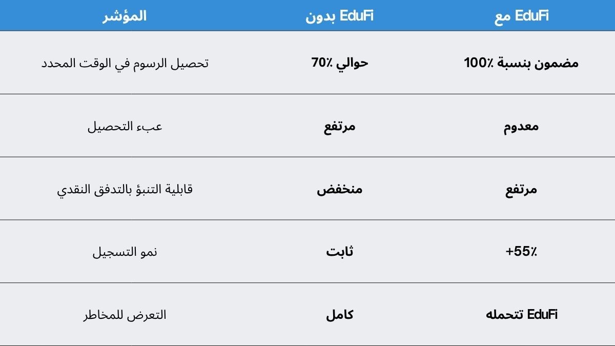 مع EduFi ما عاد فيه انتظار. جامعتك تستلم كامل الرسوم بنسبة 100% مقدّم، ونقوم إحنا بإدارة التقسيط والمتابعة والتحصيل عنكم.